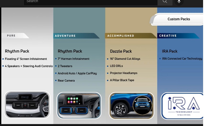 टाटा पंच में कुछ कस्टम पैक्स भी मिलेंगे, जिनमें प्योर परसॉना (डुअल एयरबैग्स, इंजन स्टार्ट स्टॉप टेक्नोलॉजी, दूसरी रो में फ्लैट फ्लोर, 90 डिग्री खुलने वाले दरवाजे और ईबीडी के साथ एबीएस) होगा। पंच के एडवेंचर परसॉना वेरियंट में फ्लोटिंग आईलैंड 4 हार्मन इन्फोटेनमेंट सिस्टम, इलेक्ट्रिक ओआरवीएम, ऑल पावर विंडोज, स्टियरिंग माउंटेड कंट्रोल्स और सेंट्रल रिमोट लॉकिंग भी है।